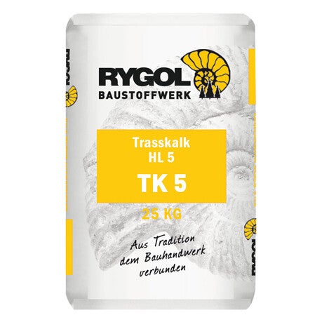 RYGOL Tras/kalk HL 5 TK 5 is een hydraulisch bindmiddel op basis van tras/kalk volgens EN 459-1. Het bindmiddel wordt toegepast voor het samenstellen van metsel-, voeg-, en stucmortels. Door de toevoeging van tras is het bindmiddel uitstekend geschikt voor het samenstellen van natuursteen leg-, en voegmortels.